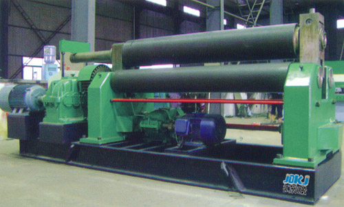 本機(jī)結(jié)構(gòu)為三輥對(duì)稱式,上輥在兩下輥中央對(duì)稱位置作垂直長降運(yùn)動(dòng),通過絲桿絲母蝸桿,傳動(dòng)而獲得,兩下輥?zhàn)餍D(zhuǎn)運(yùn)動(dòng),通過減速機(jī)的輸出齒輪與下輥齒嚙合,為卷制板材提供扭矩。